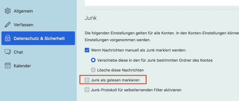 Hatte mehrfach überall herumgesucht, der Screenshot von Mapenzi scheint mir am logischsten. Das stelle ich jetzt mal auf "Junk als gelesen markieren". Mal sehen, ob es das war?! Irgendwie ist mir das immer durch die Lappen gegangen, denn ich hab es immer in Verbindung mit den beiden Punkten zuvor verbunden und nicht realisiert, dass das für sich eingestellt werden kann.