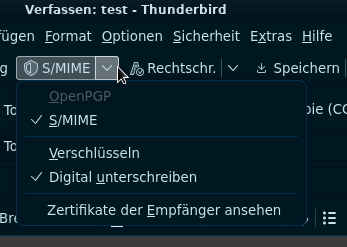 - Kontoeinstellungen -> Ende-zu-Ende-Verschlüsselung -> S/MIME Persönliches Zertifikat für digitale Unterschrift -> Auswählen