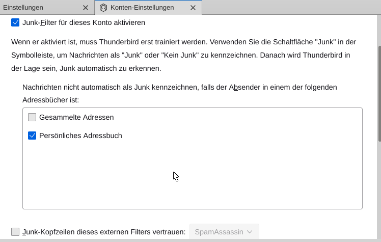Diese werden mir ständig als Junk eingestuft und entsprechend auch in den Junk-Ordner verschoben. Aufheben des Junk-Status, wie zB unter https://support.mozilla.org/de/kb/thunderb…pam-nachrichten beschrieben, führt jedoch dazu, dass diese Mail eine Sekunde danach wieder im Junk-Ordner erscheint, dann ohne Junk-Flag.