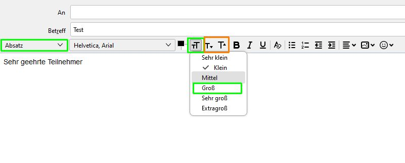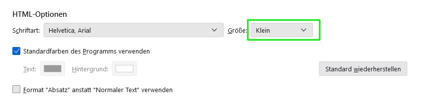 Vielen Dank für die schnelle Antwort. Habe die Umstellungen vorgenommen, es klappt, wenn ich bei jeder neuen Mail wie auf dem 2. Bild den Text auf groß stelle. Kann man das global einstellen, da ich sehr viele E-Mails schreibe, ist es blöd, wenn ich jedes Mal umstellen muss?