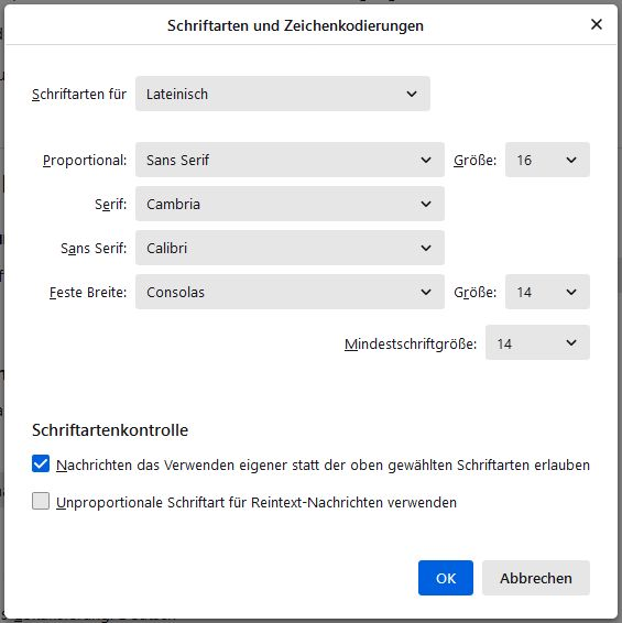 Ich habe letzte Woche Thunderbird auf einem neuen Computer installiert, Windows 10. Beim Verfassen einer E-Mail wird mir der Text, den ich schreibe sehr klein angezeigt, so dass ich ihn kaum lesen kann. Die Schrift ist auf Arial mittel eingestellt, im Ausdruck erscheint die Schrift auch so. Komischerweise erscheint auch beim Erstellen einer Nachricht der Signaturtext in größerer Schrift als vorher, nur eben mein Text nicht. Was kann ich tun, damit ich meinen Text wieder ganz normal sehen kann?