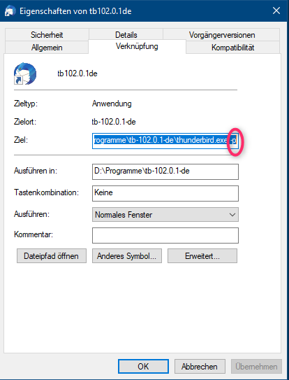 Wenn du den Profilmanager immer beim Start von Thunderbird sehen möchtest, z. B. um Thunderbird mal mit einem anderen Profil zu starten, kannst du auch den Schalter -p hinter den Pfad der Thunderbird-Desktopverknüpfung setzen.