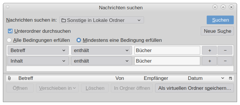 ich stelle gerade fest, dass der Schnellfilter offenkundig nicht mit Umlauten umgehen kann, wenn im "Nachrichtentext" gesucht werden soll. Im Betreff geht es. Auch ein Neuaufbau des Index (Löschung von global-messages-db.sqlite) ändert das nicht.