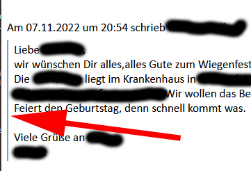 Die blaue Linie wird übrigens angezeigt, weil du das Verfassen von Nachrichten im HTML-Format aktiviert hast. Reintext-E-Mails zeigen dort stattdessen Pfeilspitzen an: