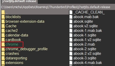 Wenn der Profilordner im Explorer geöffnet ist, TB beenden. Da sollte auch der Ordner chrome (Kleinschreibung) liegen.