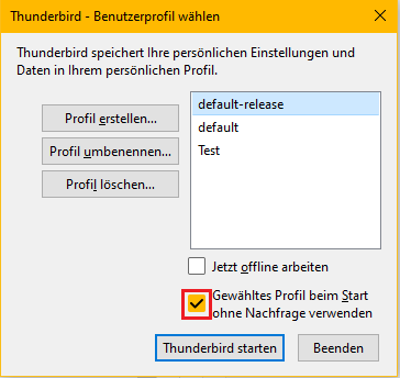 Ansonsten spricht gar nichts dagegeben, es im selben Thunderbird wirklich mal mit einem neuen Profil parallel zu probieren. Mit Hilfe des Profilmanagers kann man auch dafür sorgen, dass man beim Start dann die Wahl hat, ob das bisherige Profil oder das neue Profil geladen und genutzt werden soll.