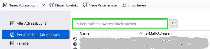 2.) Das TB Adressbuch öffnen und 'Persönliche Adressen' markieren. Damit wird der Fokus im Suchfeld nur darauf gelegt.