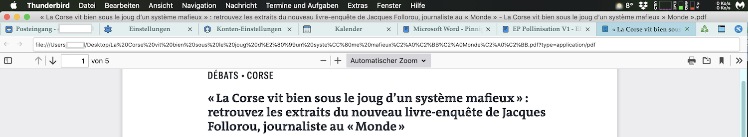 Wenn ich nun einen der Anhänge per Doppelklick öffne, wird der Inhalt der Datei in einem neuen Tab im Hauptfenster von TB angezeigt. In der Tab-Leiste oben sind drei der PDF Dateien angezeigt, darunter der Inhalt des aktiven Tabs