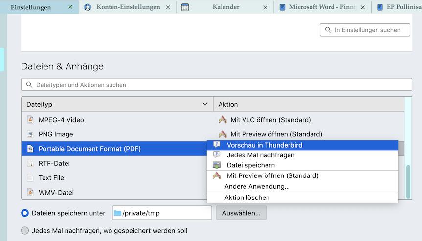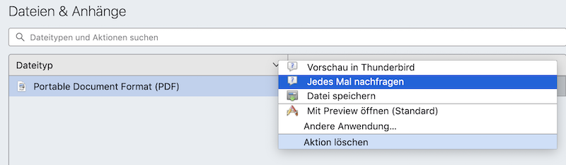 Jetzt muss ich natürlich erklären, dass ich PDF Anhänge mittels der eingebauten PDF-Viewer-Funktion von TB 102 öffnen lasse, d. h. ich habe die automatische Einstellung von TB für dieses Format nicht geändert: