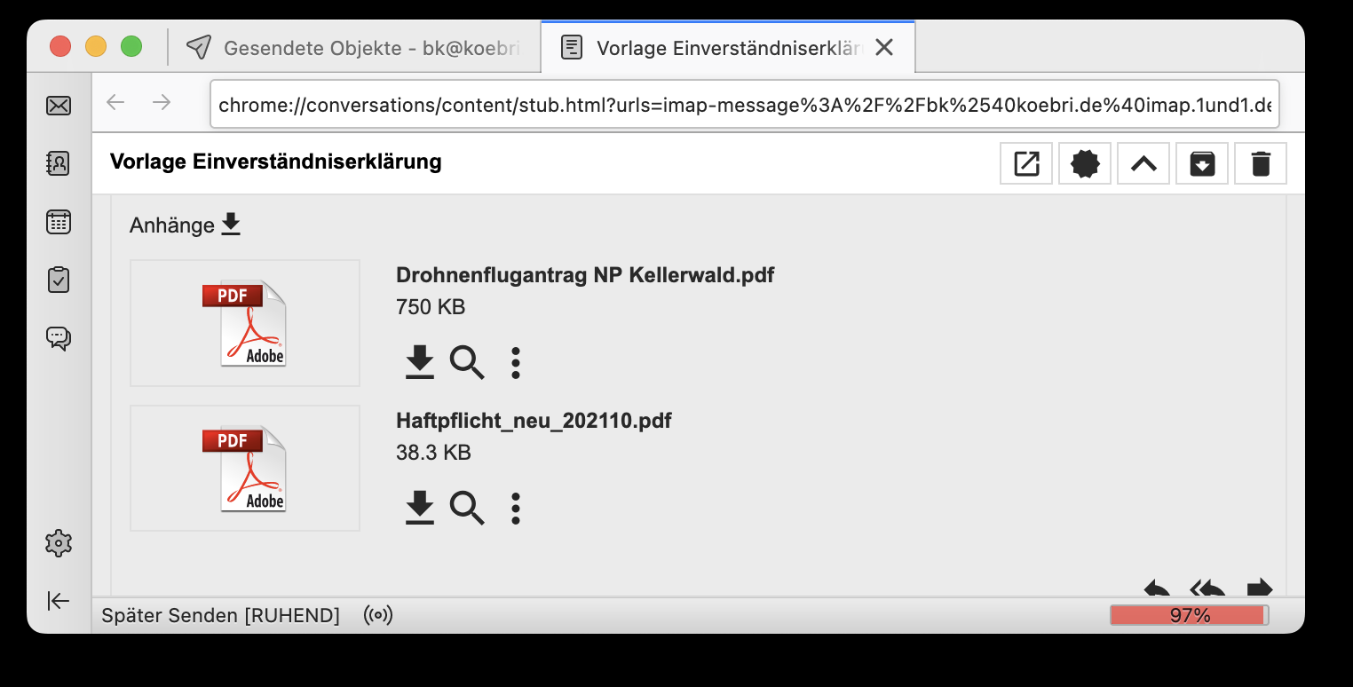 Anstatt jetzt noch den Test im Fehlerbehebungsmodus zu machen, dessen Ergebnis uns sofort auf die Piste einer Erweiterung gelenkt hätte, brauchst du nur Conversations im Add-ons-Manager zu deaktivieren und das Öffnen von Anhängen neu zu testen.