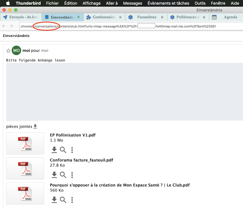 Ich habe dein Fenster in einem Testprofil nachgestellt, in dem ich Conversations installiert habe. Wenn ich eine an mich versendete und empfangene Mail mit PDF-Anhängen in einem neuen Tab öffne, sehe ich das selbe Bild