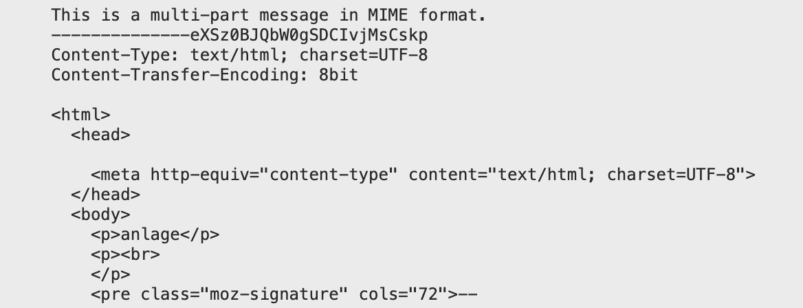 Wenn das selbe Problem immer noch auftritt, zeige den Quelltext einer solchen Nachricht an (⌘ + U) und suche die Zeilen zum "Content-Type" , die in diesem Screenshot gezeigt werden
