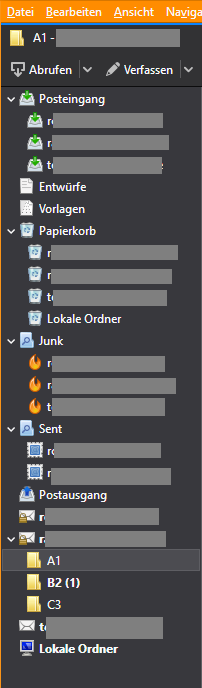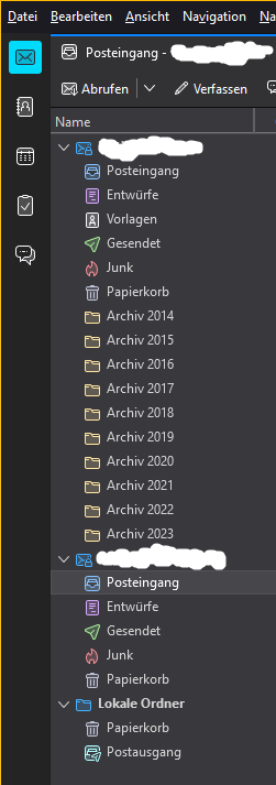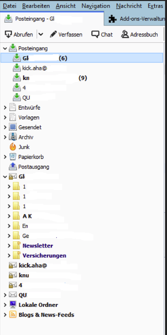Wenn die Datei also nun für Thunderbird nicht mehr da ist, Thunderbird bitte wieder starten. Lass es ein paar Minuten arbeiten. TB soll halt mit dem Start durch sein. Dann klicke wieder auf diesen Posteingang, falls der nicht eh noch von vorher markiert ist. Lass wieder ein paar Augenblicke arbeiten. Preisfrage - werden nun Mails in diesem einen Posteingang angezeigt und kann man die öffnen, lesen? Ggf. den Fokus noch mal von diesem Posteingang wegnehmen und wieder anklicken.