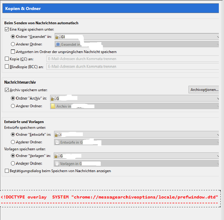 Edit: Nett, dass Du aus dem Screenshot zitierst, aber es darf auch gerne richtig sein. Dir sind gleich zwei Fehler durchgerutscht ... <!DOCTYPE overlay SYSTEM "Chrome://messagearchievoptions/locale/prefwindows.dtd". Leider gibt's auch mit Korrektur keinen Google-Treffer. Aber alleine 'messagearchievoptions' passt schon so gut zu diesem ominösen 'Nachrichtenarchivierungsoptionen'. Also bitte weg mit diesem Add-on.