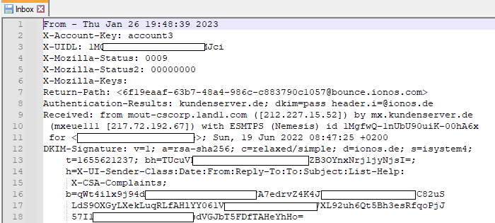 Dann, je nach dem, ob Mails weiter nicht angezeigt werden, bitte noch folgenden Test: Thunderbird wieder beenden. Dieses Mal geht es mir um den Inhalt der Datei Inbox (ohne .msf) von wieder genau diesem Posteingang. Speicherort ist von oben ja noch bekannt. Wie groß ist diese Datei? Ein paar MB, dann kannst Du das mit dem Notepad von Windows probieren, viele zig MB oder gar GB, dann brauchst Du ein Programm wie Notepad++. In erster Linie ist erst einmal nur interessant, ob diese Datei im Klartext und mit sinnvollen Inhalten lesbar ist oder ob da nur Zeichenmüll angezeigt wird. Wenn die Datei korrekt lesbar ist, dann sieht das von oben bis unten ungefähr so aus, wie das hier mit einer Inbox bei meinem Test-Thunderbird 68.x losgeht: