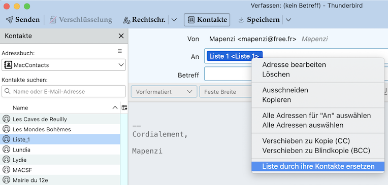 Die Verteilerlisten erscheinen aber NICHT im Mail Verfassen Fenster im Bereich der ADressbücher sondern nur als Namen in der Kontakte Liste!