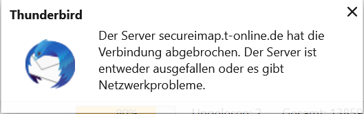 "Der Server secureimap.t-online.de hat die Verbindung abgebrochen. Der Server ist entweder ausgefallen oder es gibt Netzwerkprobleme"
