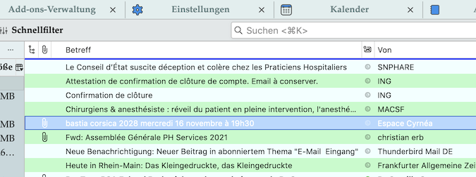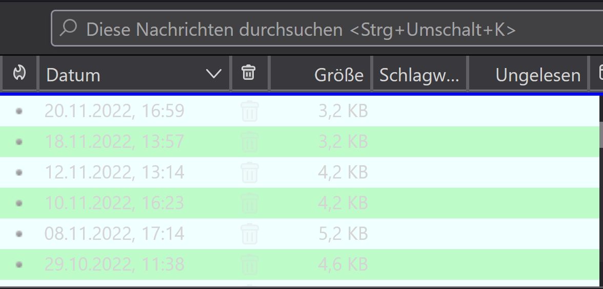 Dann verschwinden die alternierenden Reihenfarben, stattdessen sind alle Betreffzeilen schwarz mit weißer Schriftfarbe.
