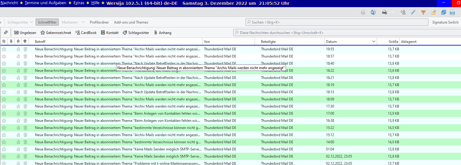 ich habe nach den letztlich positiven Rückmeldungen zu den aktuellen TB-/Betterbird-Versionen meinen LT von 91.13.1 auf 102.5.1 aktualisiert. Bisher ist mir nur etwas nachteilig aufgefallen: Der Text in den Betreffzeilen in der Nachrichten-/Themenliste ist bei mir kaum noch lesbar.