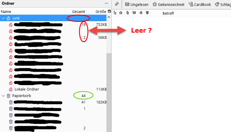 Nachtrag: Der Junk-Ordner "Lokale Ordner" zeigt 113KB Inhalte an. Auch hier bleibt bei Markierung das Fenster rechts leer...?