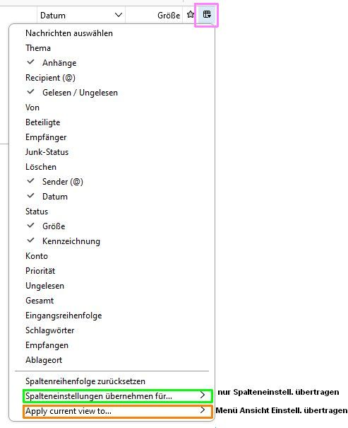 Dann über die Spalteneinstellung die Spaltenansicht und andere Ansicht-Eigenschaften auf den Junk Ordner übertragen