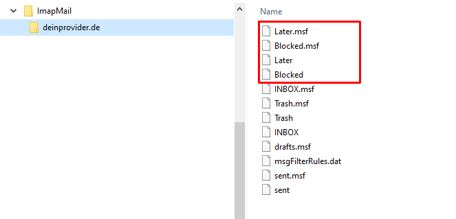 die Dateien ohne Endung Later und Blocked sowie die namensgleichen .msf Dateien dazu löschen.