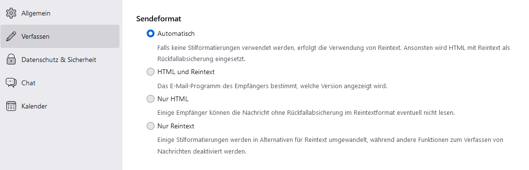 versuche unter Einstellungen -> links Verfassen -> rechts Sendeformat, wie im beigefügten Bild.