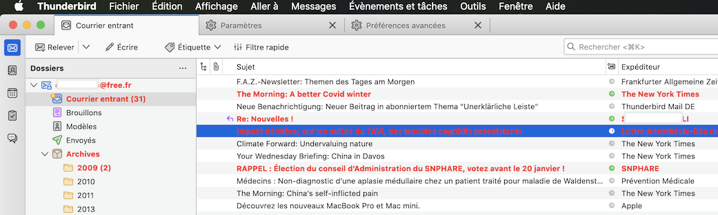 Ich weiss, mein Anliegen ist nicht bescheiden. Doch ich habe relativ viele Mailkonten mit unterschiedlich starken Ein- und Ausgängen. Da habe ich das Problem, dass ich die ungelesenen und neuen Mails oft übersehe. Zu dem Zweck habe ich folgende userChrome.css, die auch teilweise in der Version 102 funktioniert. Ich verwende eine 'gepflegte' Filtersammlung in den jeweiligen Accounts, welche die Standardmails in die jeweiligen, auch verschaltelten, Unterverzeichnisse verschieben, so dass der Posteingang entlastet wird. Noch zu sagen ist, dass ich den Darkmodus auf einem grossen Monitor verwende und die betroffenen Mails rot markiere.