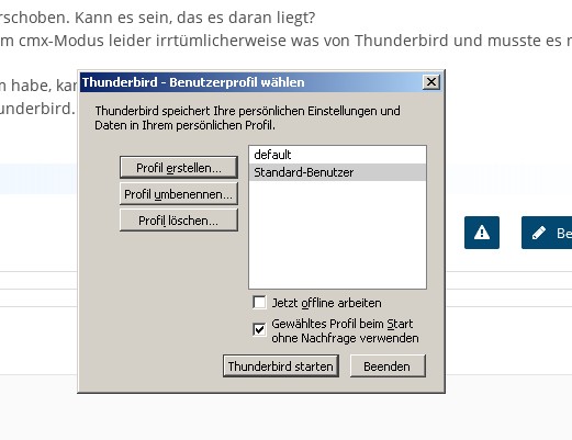 Auf einem anderen PC (Laptop) habe ich im cmx-Modus leider irrtümlicherweise was von Thunderbird und musste es neu installieren.