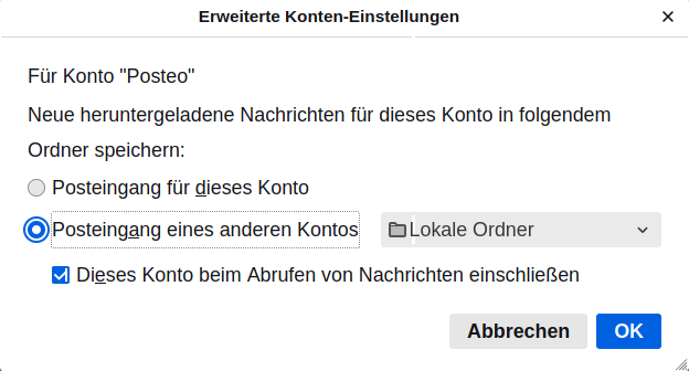 Weitere Tests haben ergeben, dass auch bei neu angelegten POP-Konten das Verhalten auftauchen kann – nachdem auf den globalen Posteingang umgestellt wurde (Tab „Servereinstellungen“ des Kontos, Sektion „Nachrichtenspeicher“, Button „Erweitert“, Option „Posteingang eines anderen Kontos“ auf „Globaler Posteingang“).