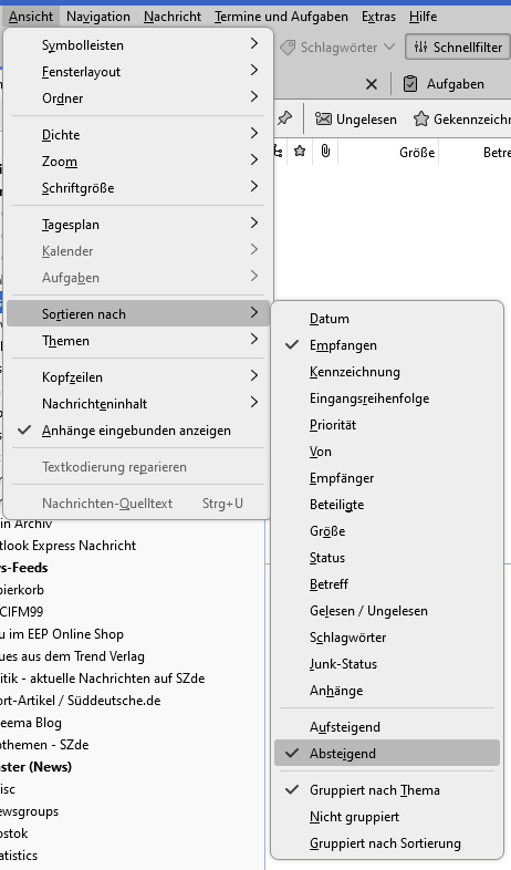 Ich finde Themenäume in TB 102 gut, möchte aber die Reihenfolge in der Anzeige ändern. Die neueste Nachricht soll immer oben stehen, also auch im zusammengeklappten Zustand immer sichtbar sein, weil ansonsten neue Nachrichten wie bei mir aktuell schnell übersehen werden. Mit den in einem anderen Thread vorgeschlagenen Einstellungen der mailnews.default Parameter habe ich experimentiert (meine Einstellungen siehe screenshot) , konnte die Anzeige aber nicht wie gewünscht ändern. Es steht weiterhin die älteste Nachricht oben