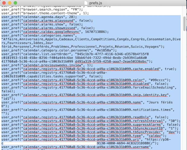 Dann öffne ich die in diesem Profil befindliche prefs.js Datei und kopiere en bloc sämtliche Zeilen, die mit user_pref("calendar... beginnen. Danach öffne ich die prefs.js Datei des Profils der neueren 102 Version (oder z.B 111.0b2), markiere darin sämtliche Zeilen, die mit user_pref("calendar ,... anfangen, und überschreibe sie mit den aus dem anderen Profil kopierten Zeilen.
