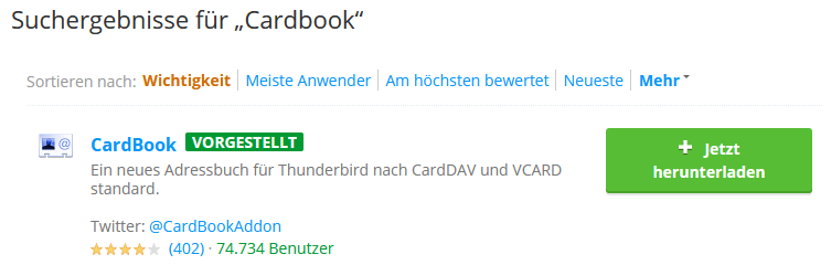 das ist aber schon seltsam. Normal wäre in der Addonsverwaltung oben in die Suchzeile CardBook eingeben, es gibt Ergebnisse.
