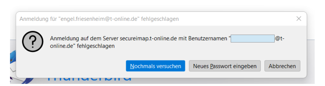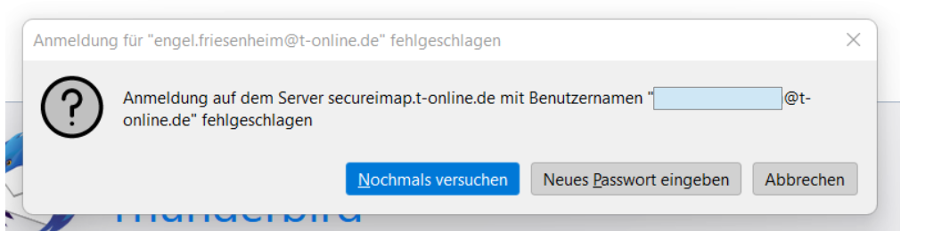 neuen Laptop angeschafft. Bisher mit Outlook gearbeitet. Möchte gerne mit Thunderbird weiterarbeiten. Es wird keine Verknüpfung zum Telekomserver aufgebaut. Erst kommt die Meldung "geben Sie ein Passwort für XX@t-online auf secureimap.t-online.de ein" dann kommt die im Titel genannte Fehlermeldung.