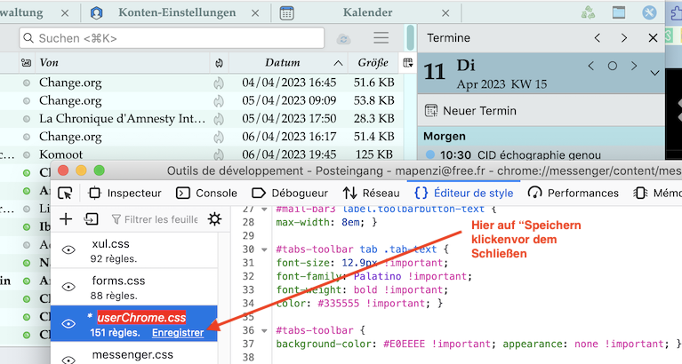 Der Bereich heißt aboutAddressbook.css und beinhaltet 178 Regeln. Das Speichern erlaubt nur "Stil-Dokument in eine Datei speichern" und es erscheint die Dateiauswahl für den Speicherort und ggf. das Ändern des Dateinamens. Dieser vorbelegte Name lautet genauso wie der Name in den Stildokumenten, nämlich aboutAddressbook.css. Da ich den Ort frei wählen kann, geht es nicht automatisch in die userChrome.css sondern separat. Ich würde ja sonst den Inhalt der vorhandenen userChrome.css überschreiben. Wenn ich den Ort also z.B. im .thunderbird auswähle, erhalte ich eine css-Datei mit 1207 Zeilen, also wohl das gesamte Adressbuch. Das kann nicht richtig sein, das wäre ja bei jeder anderen Änderung genauso.