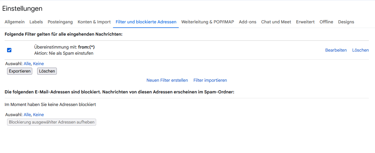 Da ich den Spam immer über Thunderbird filtern lasse, habe ich jetzt ein Filter bei Gmail erstellt, womit ich probiere den Spamfilter von Gmail komplett zu umgehen, mal schauen ob das funktioniert.