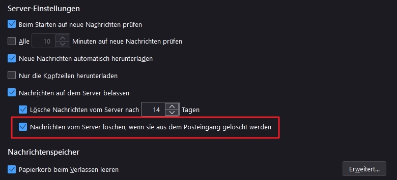 seit dem ich TB auf die neueste Version (102.10.0) upgedatet habe, habe ich bei meinem Hauptaccount (Outlook Live per POP) Probleme, wenn ich Mails löschen will. Ich kann die Mails zwar löschen, aber bei der nächsten Mailabholung sind diese Mails wieder da. Bei den anderen Accounts habe ich dieses Problem komischerweise nicht. Ist das vielleicht ein bekanntes Problem mit der neuen Version?