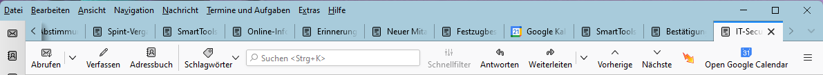 Ich habe aber auch noch viele (sehr viele) E-Mails offen. Jede neue E-Mail stellt sich hinten an. Damit wandert das Kalenderblatt. Könnte ich es z.B. ganz links fest verankern (Tab anheften) wäre schon vieles leichter.