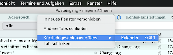 Also wenn dein Kalender-Tab sich beim versehentlichen Schließen in Position 1 rechts neben dem Mail-Tab befand, kann es über das Menü auch genau dort wieder eingefügt werden.