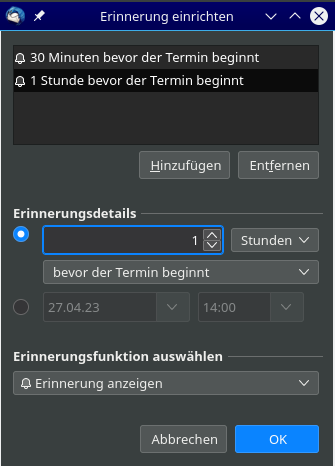 wie oft habt ihr schon Termine trotz Erinnerung schon verpasst? Mit ist es schon passiert. Um das zu verhindern kam ich auf folgende Idee für TB: und zwar fände ich es großartig, wenn ich beim Erstellen eines Termines auch die Option hätte mir zur Erinnerung eine EMail schicken zu lassen. Auch hier sollte es möglich sein diese x-Minuten vorher abzuschicken und auch parallel dazu die alten Erinnerung angezeigt zu bekommen.