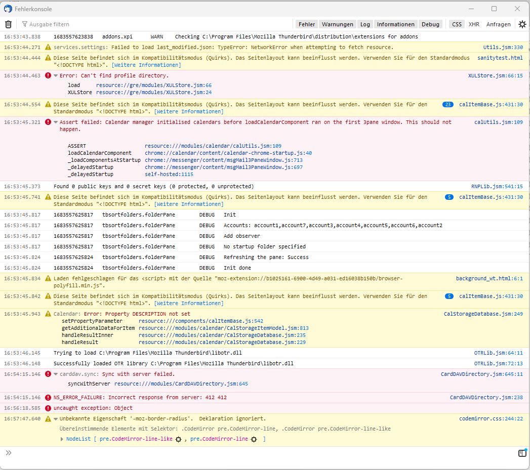 habe seit heute früh in zwei postfächern diese meldung stehen und nix geht mehr - kann nicht senden da ich immer mit zertifikat abfrage geblockt werde! und die meldung in der statusleiste unden " überprüfe den funtktionsumfang des servers..." geht nicht weg ! was kann ich tun - ich habe nichts an meinem postfächern verändert ! anbei falls es hilft ein screenshot von der fehlerkonsole !