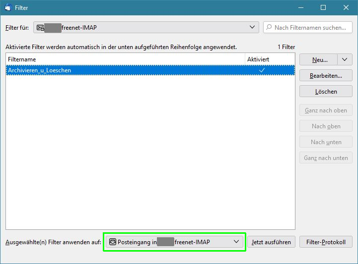 Im zweiten Bild muss Unten zugewiesen werden, auf welchen Posteingang der Filter wirken soll.