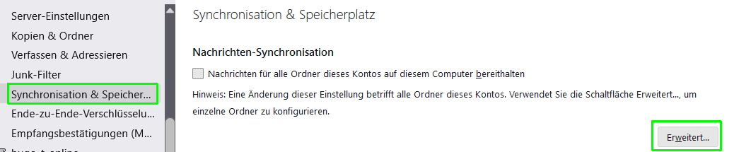 Wie im folgenden Beispielbild, lässt sich über [tmdekeyboard]Erweitert…[/tmdekeyboard] für jeden Ordner das Vorhalten zu offline Lesen einstellen.