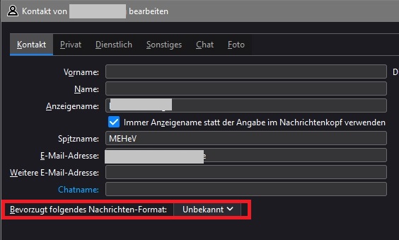 ich nutze (immer auf letzte Version updated Thunderbird). Thunderbird hat bei mir einen weissen Hintergrund mit schwarzer/grauer Schrift. Mehrere Empfänger meiner emails reklamieren aber unabhängig voneinander, dass meine email bei ihnen mit schwarzem Hintergrund ankommen. Ich hatte vor einiger Zeit dieses Thema schon einmal veröffentlicht ...jedoch keinen effektiv helfenden Lösungsvorschlag erhalten. Ich suche quasi in meinem Thunderbird-System "den besonderen Klick-button" der die unerwünschte "Verdunklung" meiner emails bei den Empfängern eleminiert d.h. Empfänger-emails in + weissem Hintergrund ändert.