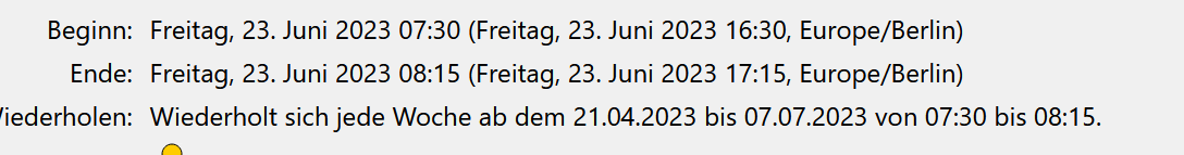 Vielen Dank. Ich habe gefühlt alle Zeitzonen überall richtig eingestellt. Aber es muss damit zusammenhängen. Wenn ich einen Termin öffne, sieht das so aus: Es sind also 9 Stunden unterschied.