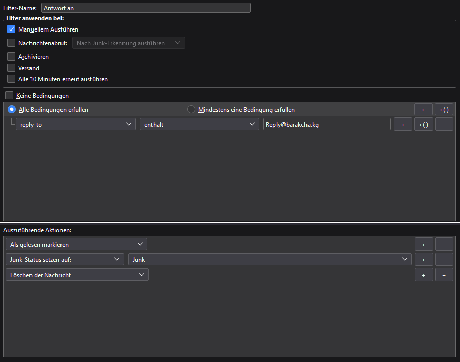Wenn ich nun, wie oben beschrieben, einen "Reply-To" Filter anlege, passiert schlichtweg nichts und ich weiß nicht warum.