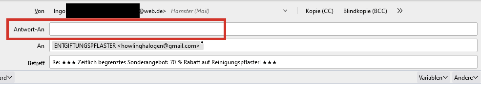 Standardmäßig ist das Feld leer und es wird an die Absenderadresse geantwortet. Gibt es denn Header denn wirklich ganz sicher in den Mail, die vermeintlich nicht gefiltert werden?