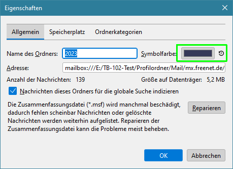 TB-Version: 78.14.0 (32-Bit) (update ist in Vorbereitung...) auf Windows 10, ich verwende "Monterail Full Dark" theme, alle normalen Ordner sind momentan türkis eingefärbt