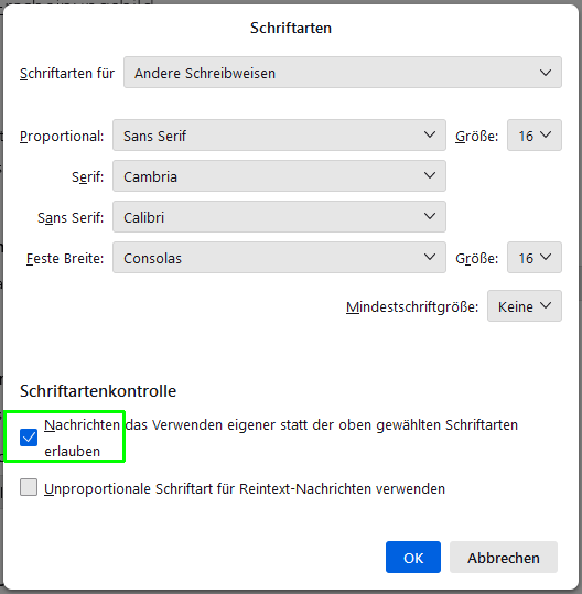 aus meinen Versuchen ermittelt --- Thunderbird Schriftgrößeneinstellungen für "Reintext"