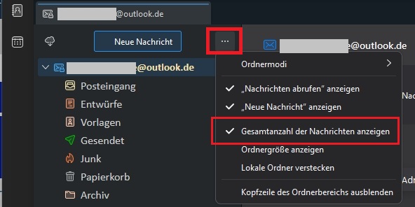 So wurde schon beiM Programmstart in der Gesamtansicht aller aufgelisteten Mail-Konten die Anzahl der im jeweiligen Konto-Ordner befindlichen, auch gelesenen Mails angezeigt.